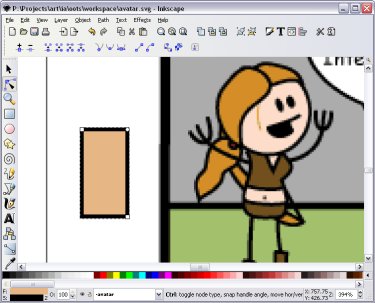Select the node tool and click the rectangle. You should see white squares and circles around it, like in the image above, instead of the grey nodes we saw in the arms and legs of our avatar. This is because rectangles are a basic shape type in Inkscape and SVG; it's fixed into a rectangle shape. If you move those handles, you can give it rounded corners and change its dimensions, but that's about it.