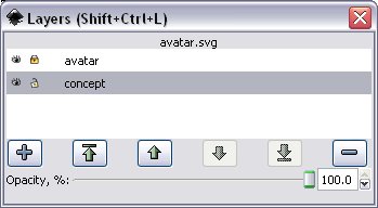 You should now see the Layer window with two layers: "concept" and "avatar". We probably want the avatar layer to be at the front, so move them around using the arrows. (We could have done this in the add layer window by choosing the position of "below current", but it's just as easy to do it this way).